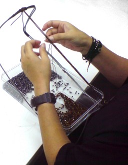 石の状態を確かめて連を選抜、さらにその連の中からも程度の悪い粒を除外しています。選抜した石を、柔らかい上質な牛革に合わせ、一粒一粒、丹念に編み込んでいきます。留め具のボタンはもちろんシルバー925。これがシルバーだとトータルの高級感が全然違います。