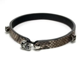 ただでさえカッコいいレザーチョーカーにシルバーの留め具をセット。もちろん留め具といってもただのパーツではなく、シルバーアクセサリーとして見栄えのするシンプルラウンド型(macn002)とスカル(macn017)をチョイス。それをスタンダードな牛革(こげ茶)、ハードなかっこ良さのパイソン革というタイプの異なる2種類で作りました。どちらも悩ましい選択。よれにくく型崩れがしにくいしっかり厚めの革を使っていますので、チョーカーとしての機能性も一級品です。こだわりのチョーカーをご堪能ください。